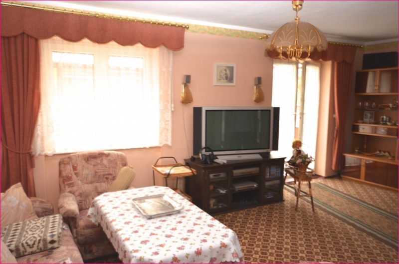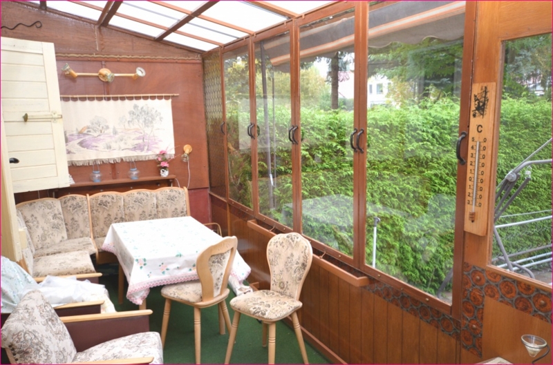 Vom Wohnzimmer gelangen Sie direkt in einen nicht mehr zeitgemäßen Wintergarten und in den Garten.