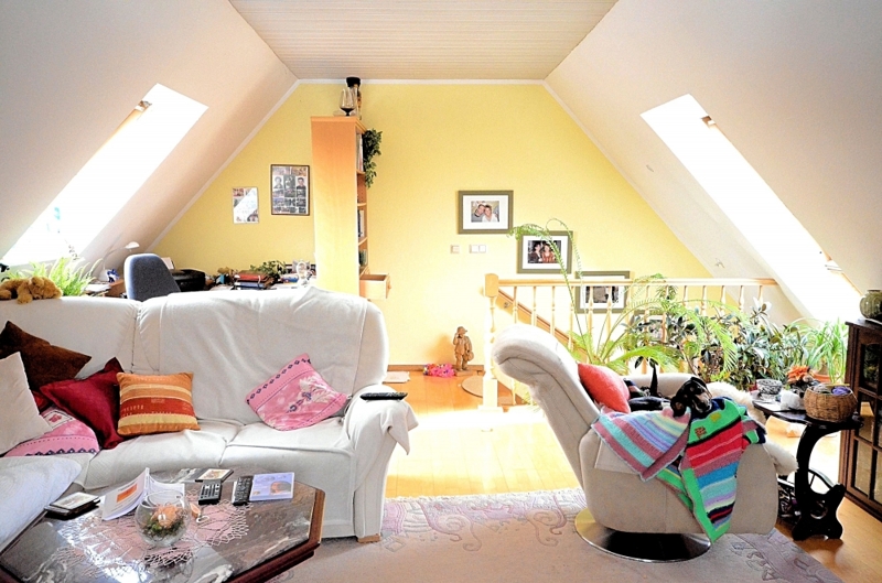 Auf den teilweise ausgebauten Dachboden gelangen Sie über eine massive Holztreppe, welche sich zwischen den beiden Wohnungszugängen im Wintergarten befindet. Hier wurde ein weiteres Zimmer ausgebaut, stellt jedoch durch die Raumhöhe von ca. 2,00 m keine Wohnfläche dar.