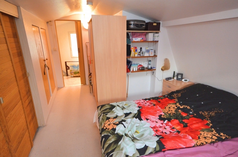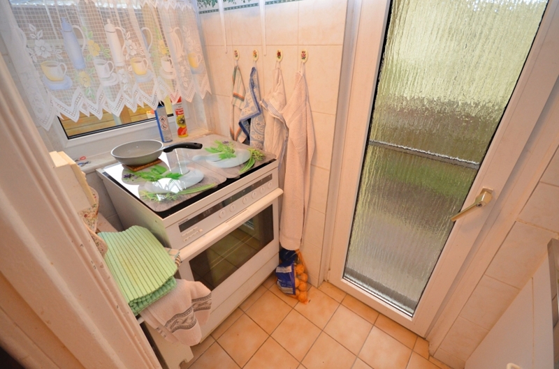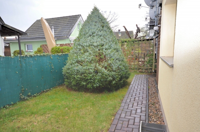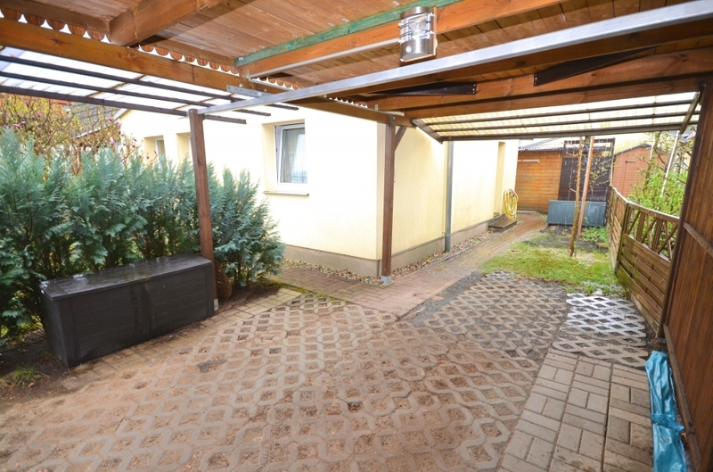 Vom Eingangsbereich gelangen Sie direkt in die Diele mit angrenzendem offenen Wohnzimmer, welche nur durch Balken, die einen Raumteiler darstellen, abgetrennt sind. Vom Wohnzimmer kommen Sie direkt in die Küche, welche über einen Essplatz für 2 Personen verfügt. Die Einbaumöbel, sowie teilweise die elektrischen Geräte, sind mit im Kaufpreis enthalten. Von der Küche erreichen Sie einen kleinen Flur, indem sich der Elektroherd und die Spüle befindet. Von hier haben Sie auch direkten Zugang in den Garten. Das geflieste Duschbad mit WC , Handwaschbecken und Handtuchtrockner erreichen Sie direkt von der Küche aus. In das Obergeschoss gelangen Sie über eine schmale Treppe, die sich ebenfalls in der Küche befindet. Hie steht Ihnen ein Schlafzimmer mit Klimaanlage und ein WC mit Handwaschbecken zur Verfügung. Den Keller erreichen Sie über einen separaten Zugang von außen. Hier befindet sich der Heizungsraum sowie ein Abstellraum. Auf dem Grundstück stehen zwei Holzgeräteschuppen und ein PKW-Carport. Das Grundstück ist eingezäunt und liebevoll angelegt.