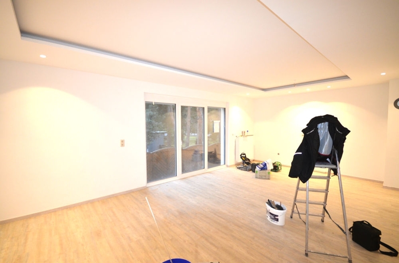 Auf moderne Akzente wurde bei der Ausstattung der Wohnung geachtet. So wurden dimmbare indirekte Beleuchtungselemente in abgehangene Decken verbaut.