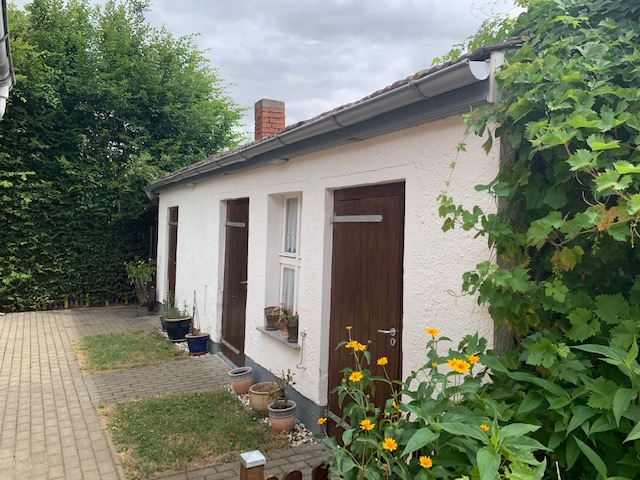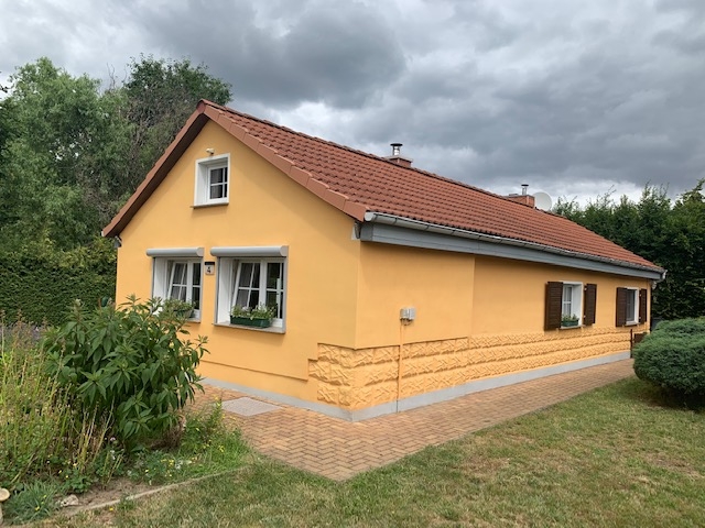 Das in Massivbauweise errichtete Einfamilienhaus im Bungalowstil verfügt bei ca. 89 m² Wohnfläche über zwei Zimmer und ein Speisezimmer. Es wurde im Jahre ca. 1962 errichtet und im Jahre 1979 sowie im Jahre 2007 erweitert. Sie betreten das Einfamilienhaus über den nicht heizbaren Wintergarten. Von dort gelangen Sie direkt in das Speisezimmer. Geradezu erreichen Sie die Küche mit Essplatz sowie einen Flur mit direkten Zugang in den Garten. Vom Speisezimmer rechts gehend, gelangen Sie in das geflieste Duschbad mit WC und Handwaschbecken, das Wohnzimmer mit Kaminofen sowie das geräumige Schlafzimmer, wobei das Wohnzimmer ein Durchgangszimmer darstellt. Als weitere Bebauung befindet sich auf dem Grundstück ein PKW-Carport und massives Nebengelass. Das Grundstück ist komplett eingezäunt und die Gehwege gepflastert.