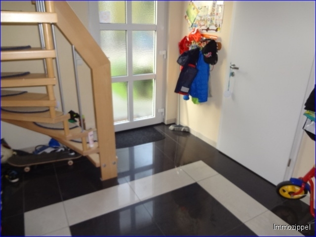 EG: Rechtsseitig in der Eingangsdiele befindet sich das Duschbad mit WC und Handwaschbecken. Ebenfalls auf der rechten Seite gelangen Sie in den Hauswirtschaftsraum mit den Anschlüssen für die Waschmaschine und den Trockner. Linksseitig der Diele kommen Sie in die offene, modern ausgestattete Küche, mit direktem Zugang in das Wohnzimmer und Zugang auf die befestigte Terrasse. Von hier haben Sie einen wunderschönen Blick in den angelegten Familiengarten, der auch Kinder zum Spielen einlädt. In der Eingangsdiele geradezu erreichen Sie das zweite Zimmer auf dieser Ebene. Die Massivholztreppe, die Sie in das Dachgeschoss führt, befindet sich rechts der Diele.