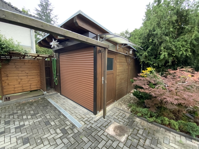 Das Grundstück ist komplett eingefriedet, angelegt, gepflegt und teilweise von einer Hecke umzäunt. Auf dem Grundstück befindet sich eine massive Garage, ein massives Nebengelass mit mehreren Räumen für Abstellmöglichkeiten von Gartengeräten, Freizeitzubehör und Ähnliches, ein Gewächshaus und ein Holzschuppen. Eine überdachte Terrasse lädt zum Verweilen ein.