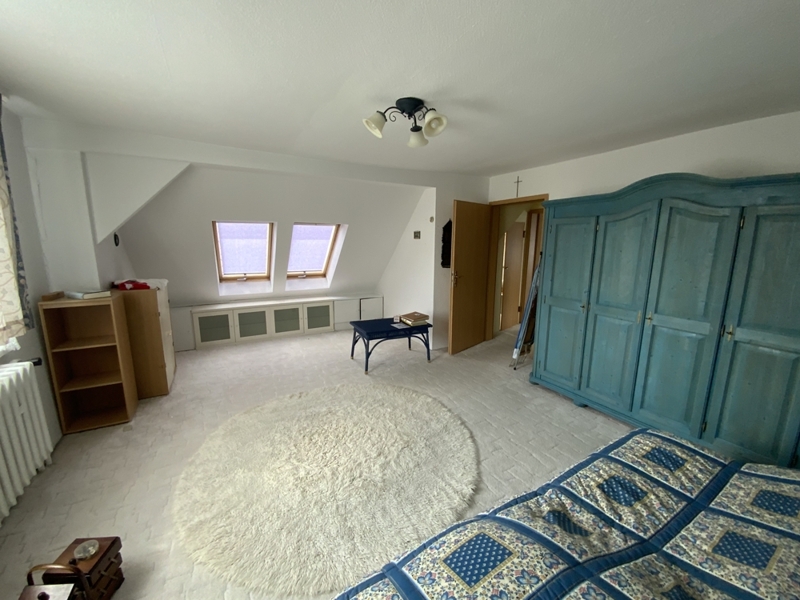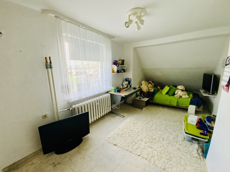Über eine charmante Holztreppe im Flur gelangen Sie in das ausgebaute Dachgeschoss, das zwei weitere Zimmer sowie ein kleines Bad mit WC und Handwaschbecken beherbergt – ideal als Kinder-, Arbeits- oder Gästezimmer.