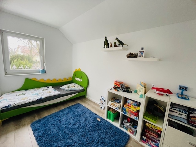 Eine weitere Treppe (Raumspartreppe) erschließt den im Nachgang ausgebauten Spitzboden, der aktuell als Schlafzimmer genutzt wird. Obwohl dieser Bereich nicht in die Wohnfläche von ca. 107 m² eingerechnet ist, erweitert er die Nutzungsmöglichkeiten erheblich. Mit rund 50 m² zusätzlicher Nutzfläche eignet er sich ideal für Hobby- oder Freizeitaktivitäten.