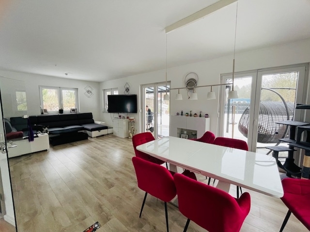 Im Erdgeschoss befinden sich ein Hauswirtschaftsraum, ein Gäste-WC mit Dusche und Handwaschbecken sowie der großzügige Wohnbereich. Dieser umfasst ein helles Wohnzimmer mit integriertem Essbereich und direktem Zugang zur angrenzenden Küche. Vom Wohnzimmer aus gelangt man auf die überdachte, befestigte Terrasse, die einen schönen Blick in den gepflegten Garten eröffnet.