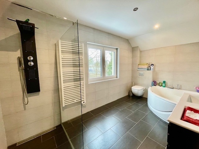 Über eine massive Buchenholztreppe führt der Flur ins Dachgeschoss. Dort stehen vier weitere Zimmer zur Verfügung, die flexibel als Schlaf-, Kinder- oder Arbeitszimmer genutzt werden können. Ergänzt wird die Etage durch ein geräumiges Badezimmer mit Badewanne, separater Dusche, WC und Handwaschbecken.
