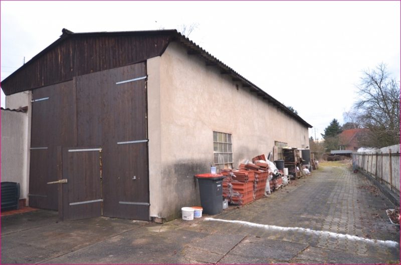 Das Grundstück ist mit einer teilmassiven Lagerhalle bebaut, welche eine Grundfläche von ca. 10,50 Meter x 26 Meter hat. Die Zuwegung zum Grundstück hat eine Tiefe von ca. 35 Meter und eine Breite von ca. 4,50 Meter. Die anfallende Abriss- und Entsorgungskosten sowie die Teilungs- und Vermessungskosten sind vom Käufer zu tragen.